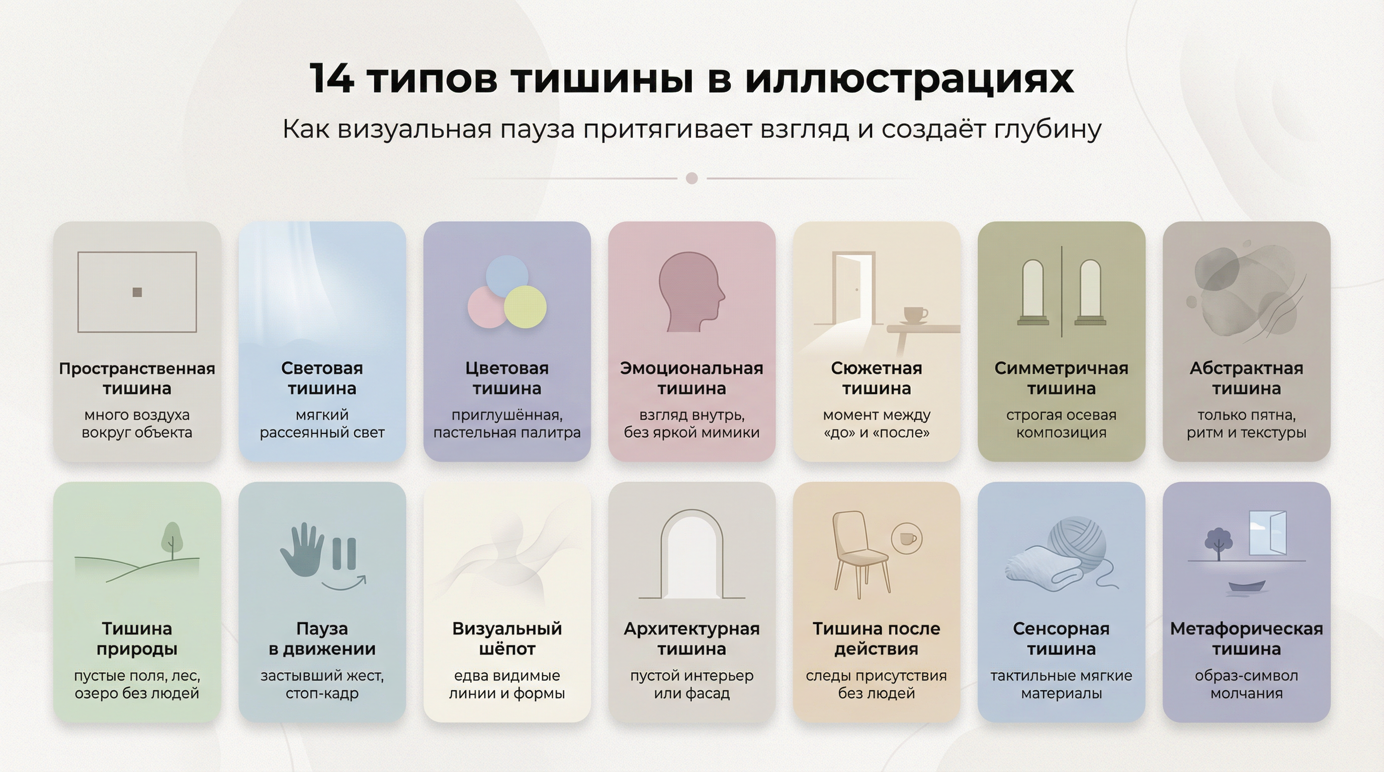 В этой статье мы разберём 14 типов визуальной «тишины» — от пространственной до метафорической — вы узнаете, как использовать её в создании иллюстраций.