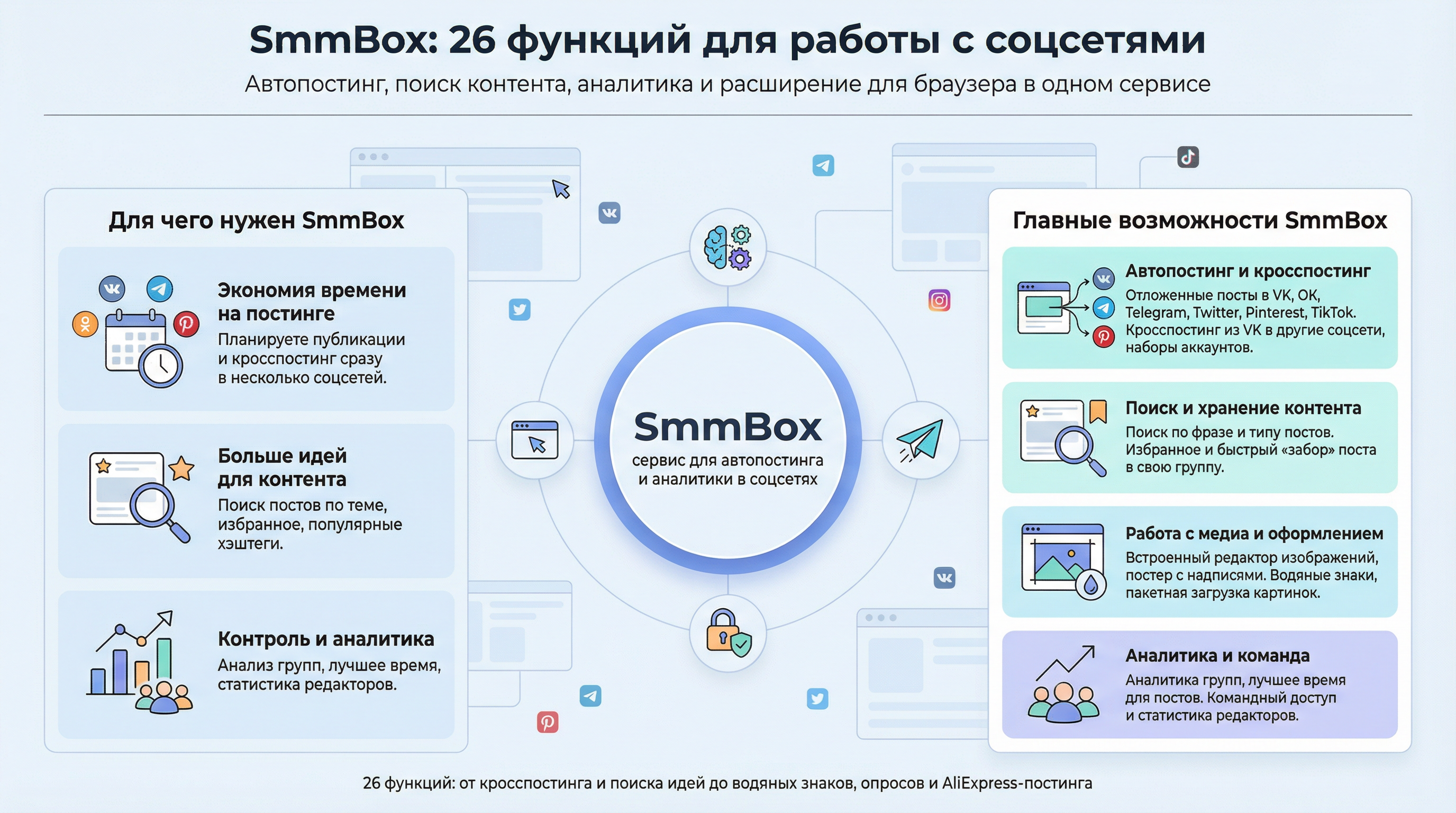Сервисы для SMM-специалистов, в том числе СммБокс, делают работу в социальных сетях более продуктивной. Поделюсь с вами списком большей части функций упомянутого выше сайта (автопостинг, поиск постов, аналитика и т.д.), чтобы вы легко могли найти для себя подходящие.