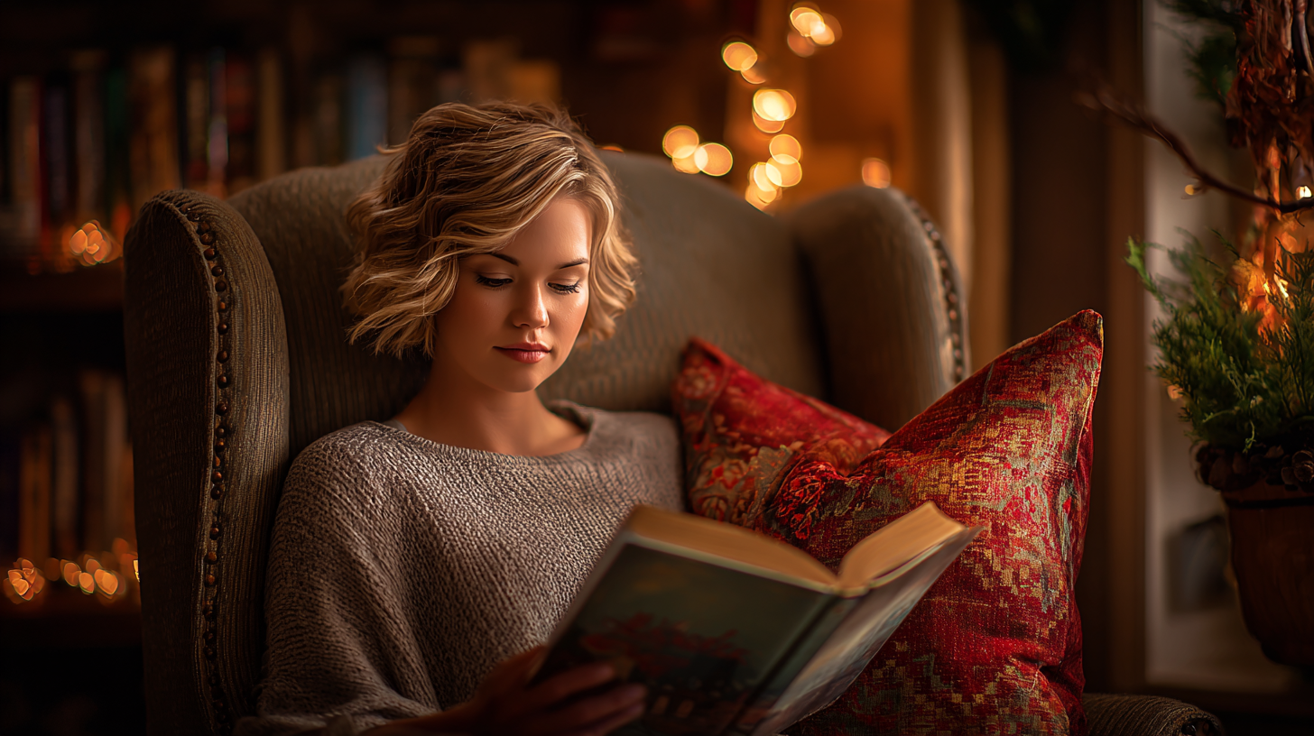 Женщина с блонд-бобом свернулась в кресле и читает праздничную книгу; вокруг рождественские подушки и тёплые огни.