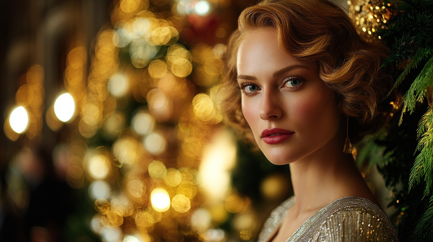 Элегантность и праздничный блеск: вечернее платье, роскошные локоны, сияние гирлянд. Образ — высокая мода, но уютный благодаря тёплому свету.