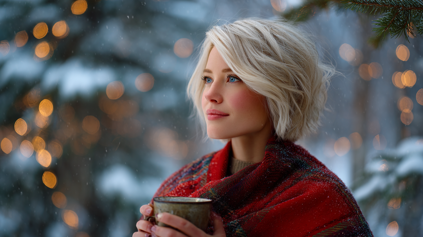A stylish woman with a soft blonde bob wrapped in a fluffy red plaid, standing among snowy fir trees, holding a steaming mug. Snow gently falling, early morning blue hour, twinkle lights in the background, Canon EOS R6 + 85mm f/1.4, natural soft winter light, cozy Pinterest winter vibes.