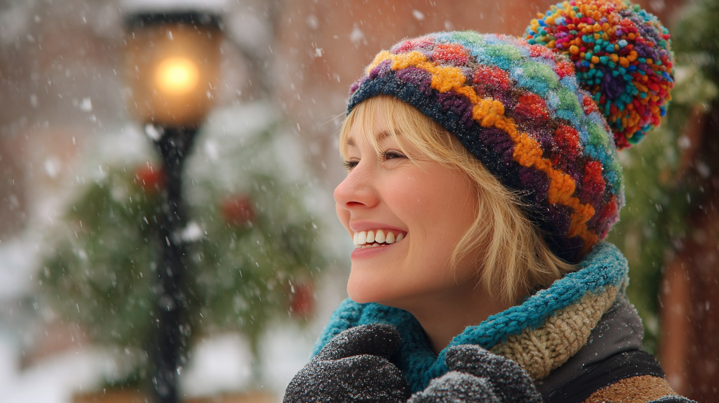 - Шапка с помпоном и снегопад → живой смех и динамичность;