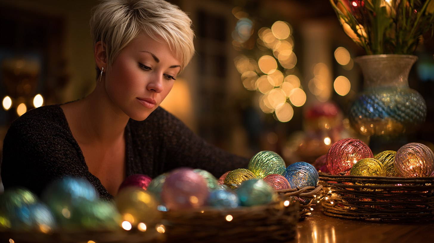 Creative portrait of a woman with short blonde hair, sitting at a table, arranging colorful Christmas ornaments and glass balls in baskets, twinkling fairy lights reflecting in ornaments, Sony A7C + 85mm f/1.8, high-key Pinterest tabletop creativity.