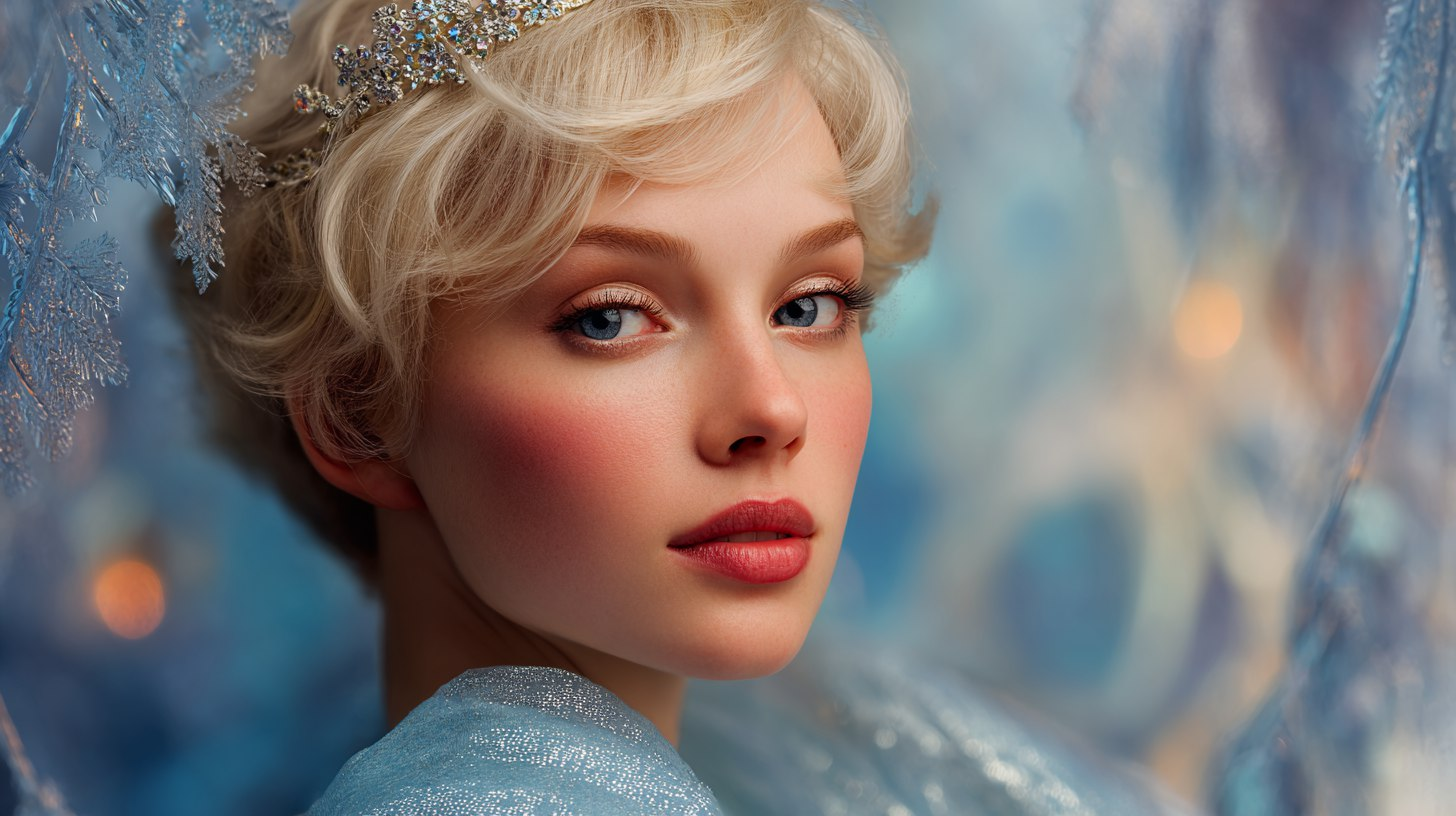 Regal woman with a short blonde bob, wearing a shimmering icy blue dress and a delicate crystal tiara, soft frosty makeup with pearly highlights, surrounded by a sparkling abstract winter background with frost patterns and icy textures. Cool-toned lighting, Nikon Z7 II + 85mm f/1.2, ethereal Pinterest winter queen aesthetic.