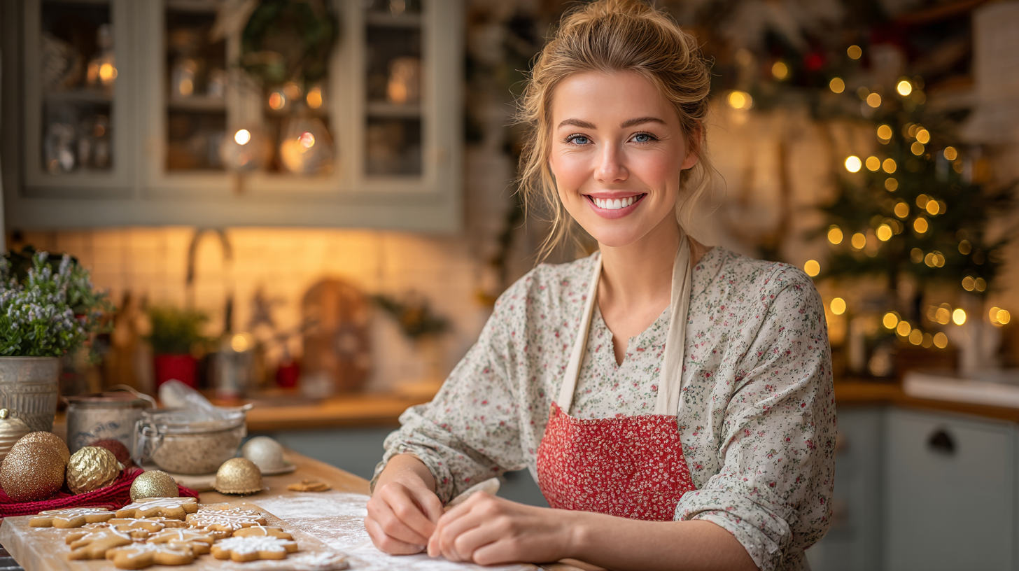 A cheerful blonde woman in a cute apron decorating gingerbread cookies, white kitchen, flour on cheeks, Christmas ornaments around, soft tungsten light, Sony A7IV + 50mm f/1.4, playful Pinterest holiday baking setup.