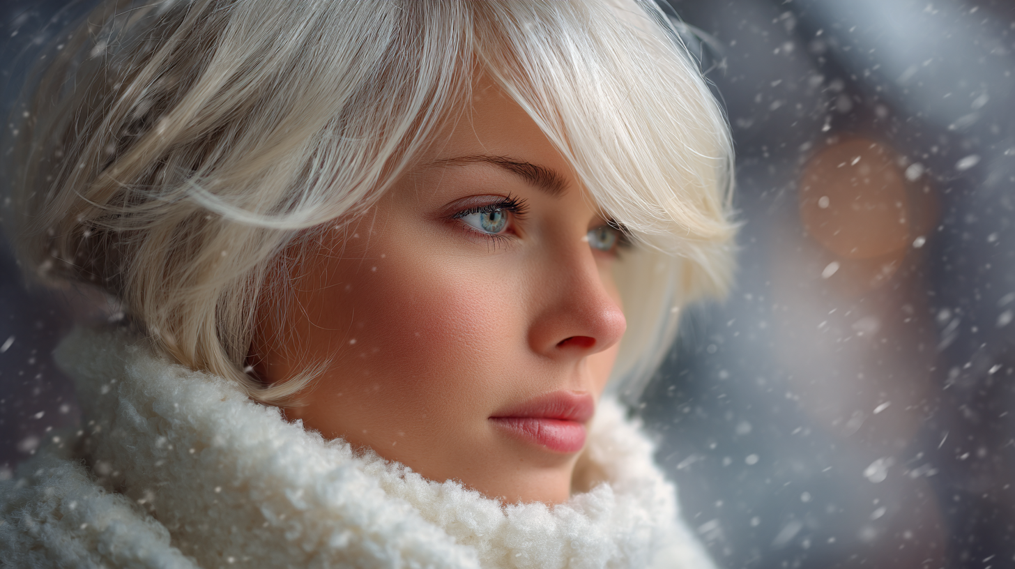 Мягкий портрет женщины с короткими волосами, снежинки оседают в волосах; белый шарф и размытый снежный фон.