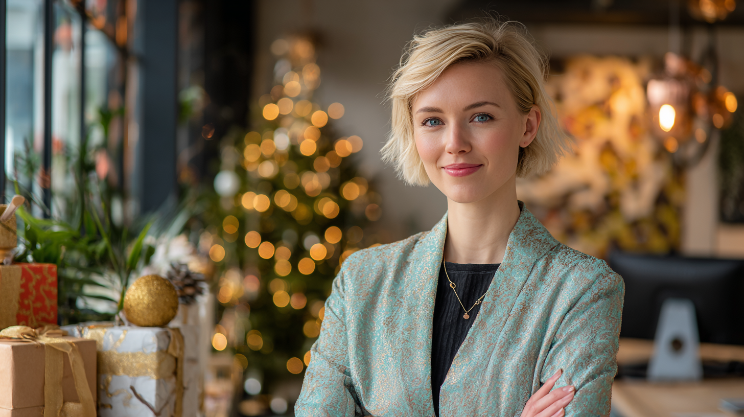 Woman with short blonde bob in a festive blazer, standing in a modern office decorated with a Christmas tree and gifts, bright confident smile, daylight, Nikon Z6 + 50mm, fresh corporate Pinterest holiday portrait.