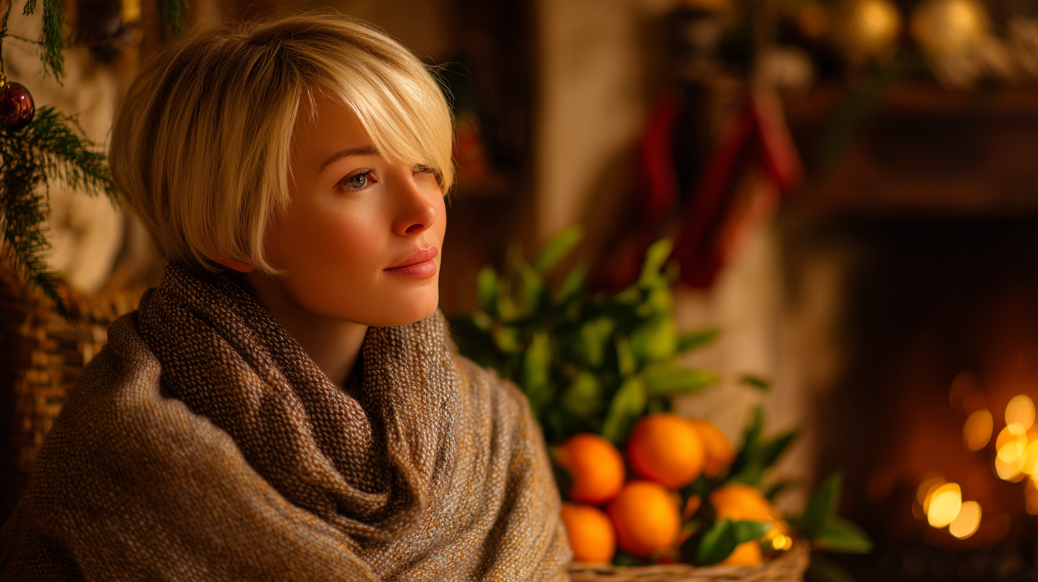 Женщина с коротким блонд-бобом, завернутая в большой вязаный шарф, сидит у горящего камина; рядом мандарины, носки и подарочная бумага.