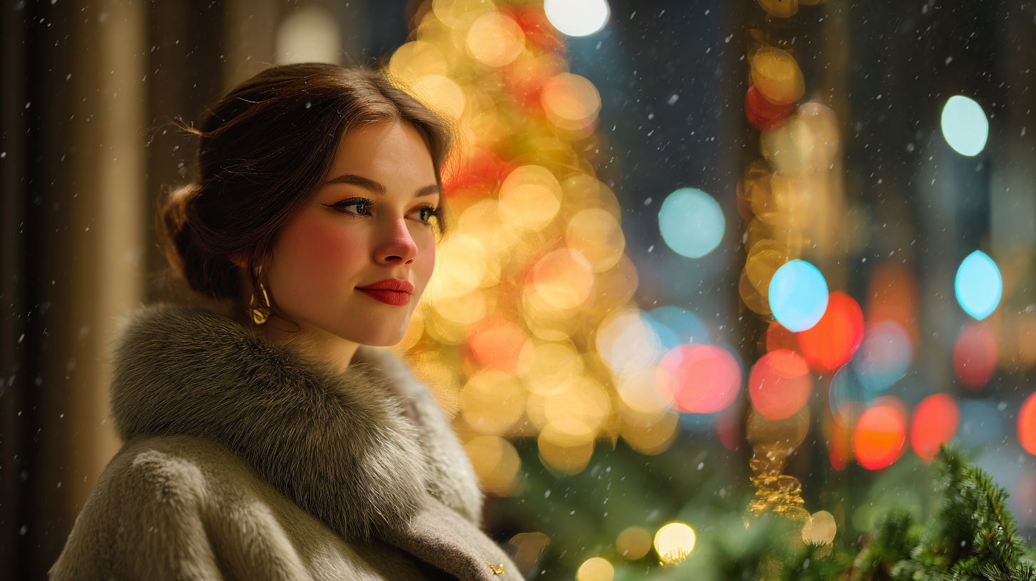 Утончённая женщина в шубке из искусственного меха на фоне большой освещённой ёлки; падает снег, городские огни создают кольца боке.