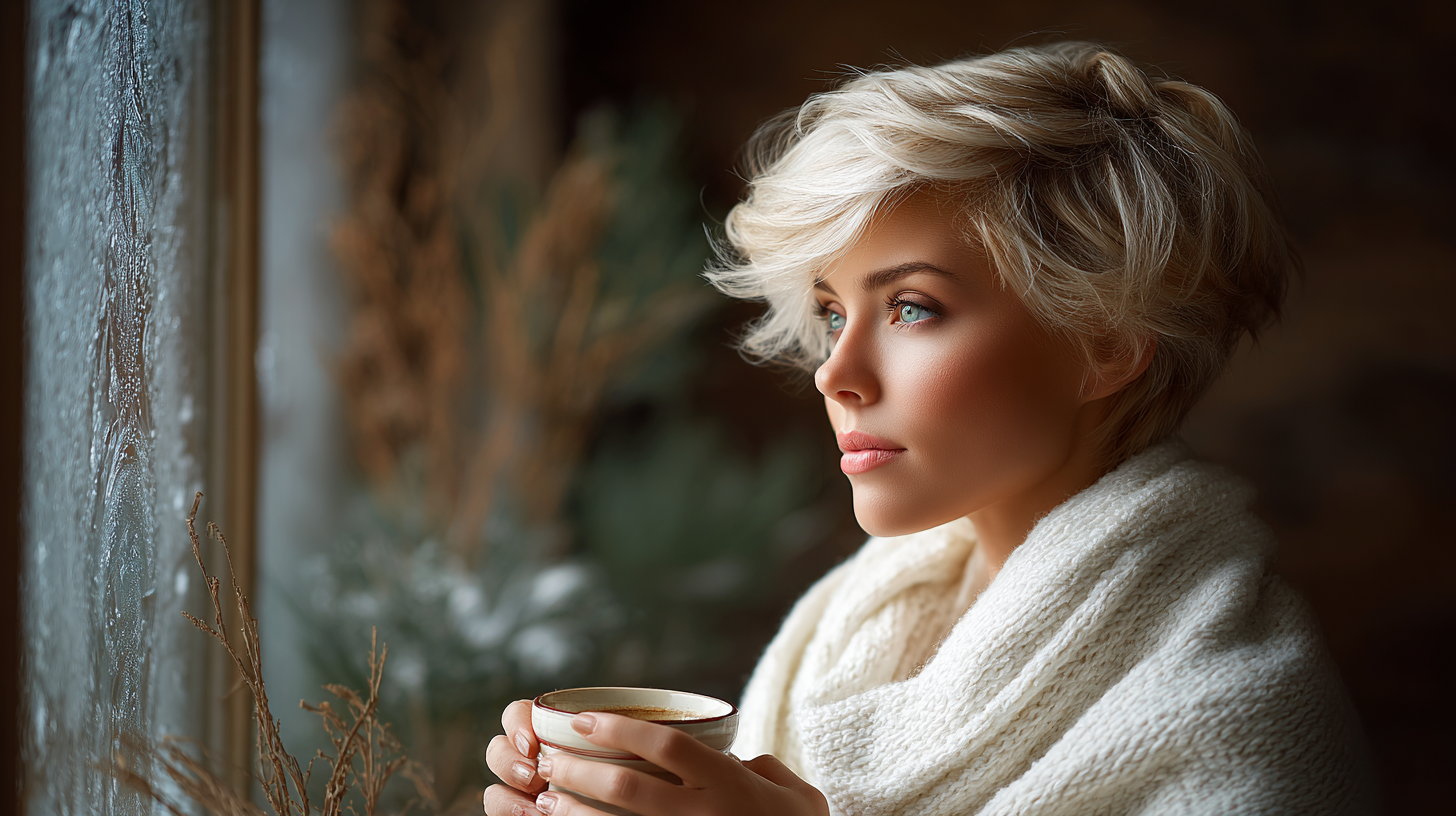Elegant woman with a short blonde bob, wrapped in a white knitted plaid, holding a mug, sitting by a frosted window, soft morning light, Canon EOS 5D Mark IV + 85mm, dreamy Pinterest winter morning portrait.