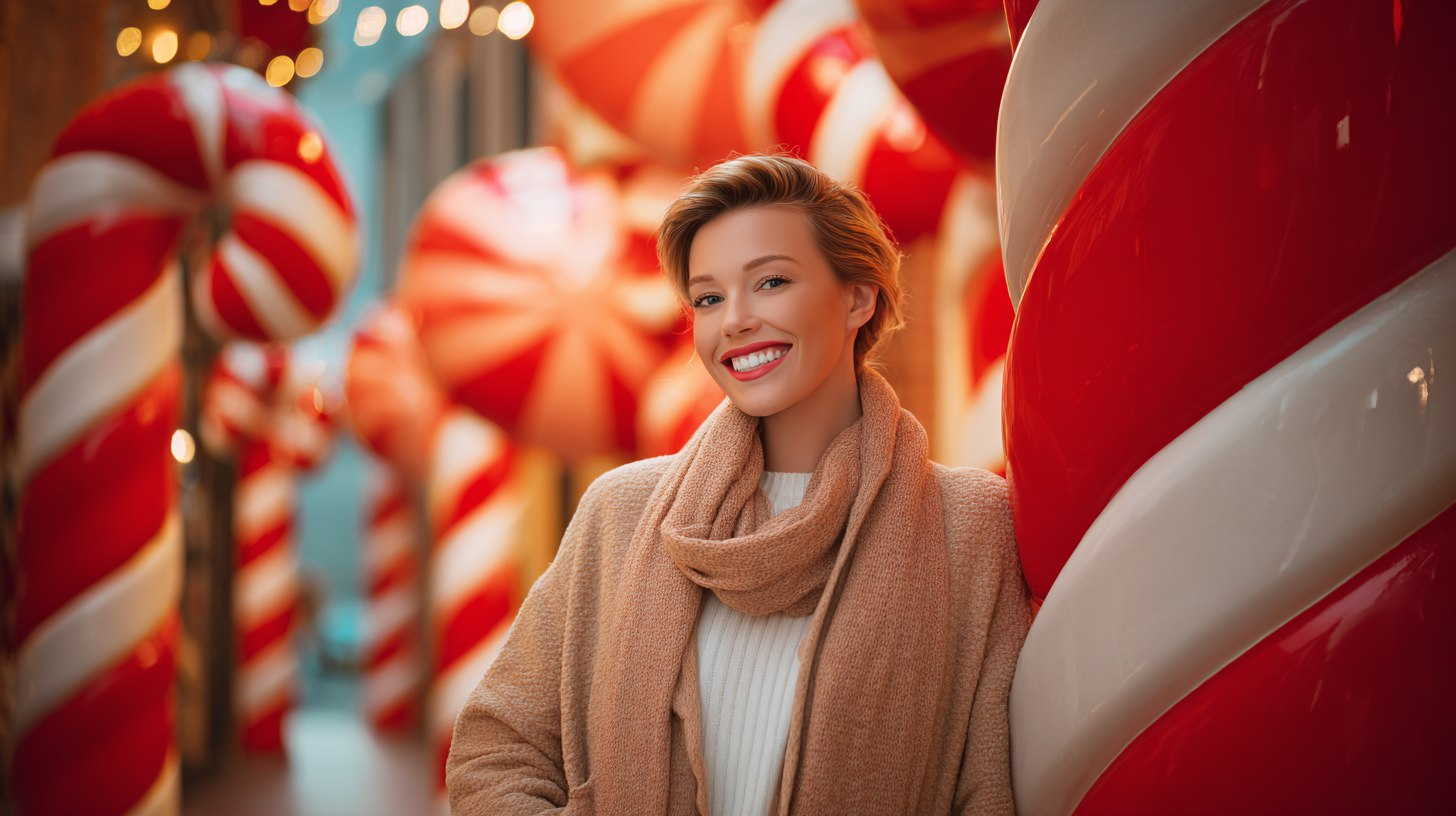Chic woman standing in a candy cane-themed photo zone, giant red and white striped props, laughing and holding a huge candy cane, Sony A7III + 50mm, vibrant colors, Pinterest holiday fun.