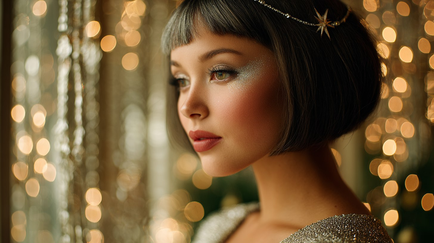 Woman with a bob haircut, silver glitter makeup, small star accessories in her hair, dressed in a sparkly dress, silver background with shimmering fairy lights, Sony A7RIII + 85mm f/1.4, dramatic softbox light, Pinterest glam holiday party.