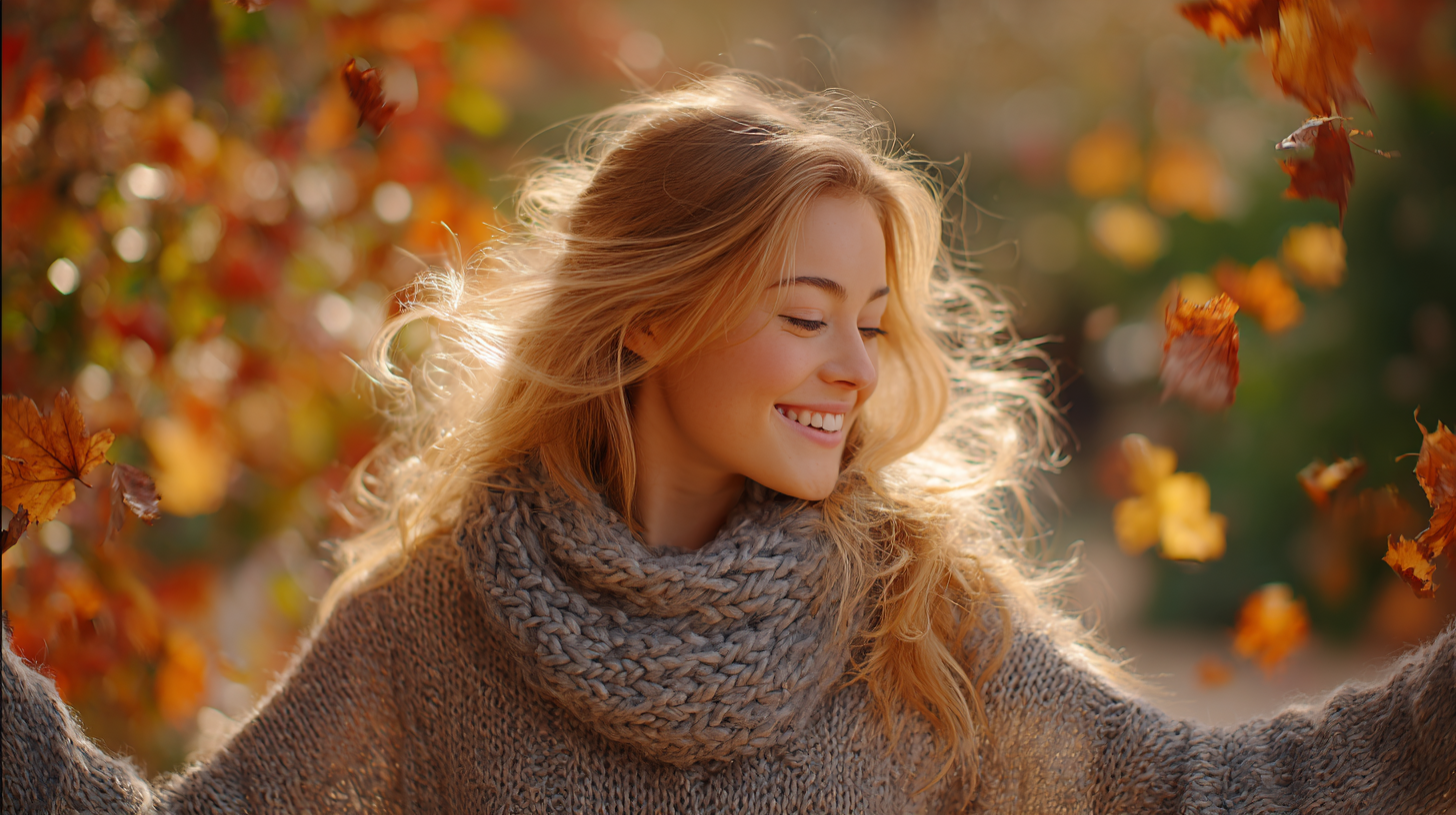 Модная осенняя фотосессия в парке: светловолосая женщина в объёмном фактурном вязаном шарфе и уютном свитере, радостно смеётся и с энергией подбрасывает в воздух охапку ярких кленовых листьев, вокруг закручиваются золотые и красные листья, солнечный яркий свет золотого часа, мягкий задний свет, динамика движения, сильное боке, малое поле глубины резкости, съёмка на Canon EOS R5 и объектив 85mm f/1.2L, ультра высокое разрешение, живая, искренняя, счастливая атмосфера.