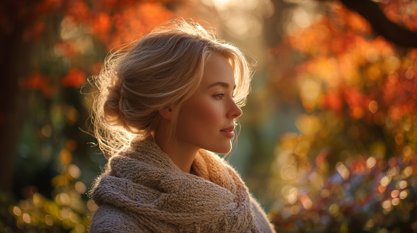 Fashion editorial, backlit autumn portrait of a woman with blonde hair, wearing a large textured knitted scarf, standing gracefully among tall trees, soft golden sun rays filtering through glowing autumn leaves, her hair gently illuminated by warm sunset backlight, dreamy and magical mood, background filled with beautiful bokeh of vibrant red and yellow foliage, cinematic shallow depth of field, ultra high-resolution, captured on Canon EOS R5 with 85mm f/1.2L lens, ethereal tranquil atmosphere. --ar 16:9 --profile jw3gbei