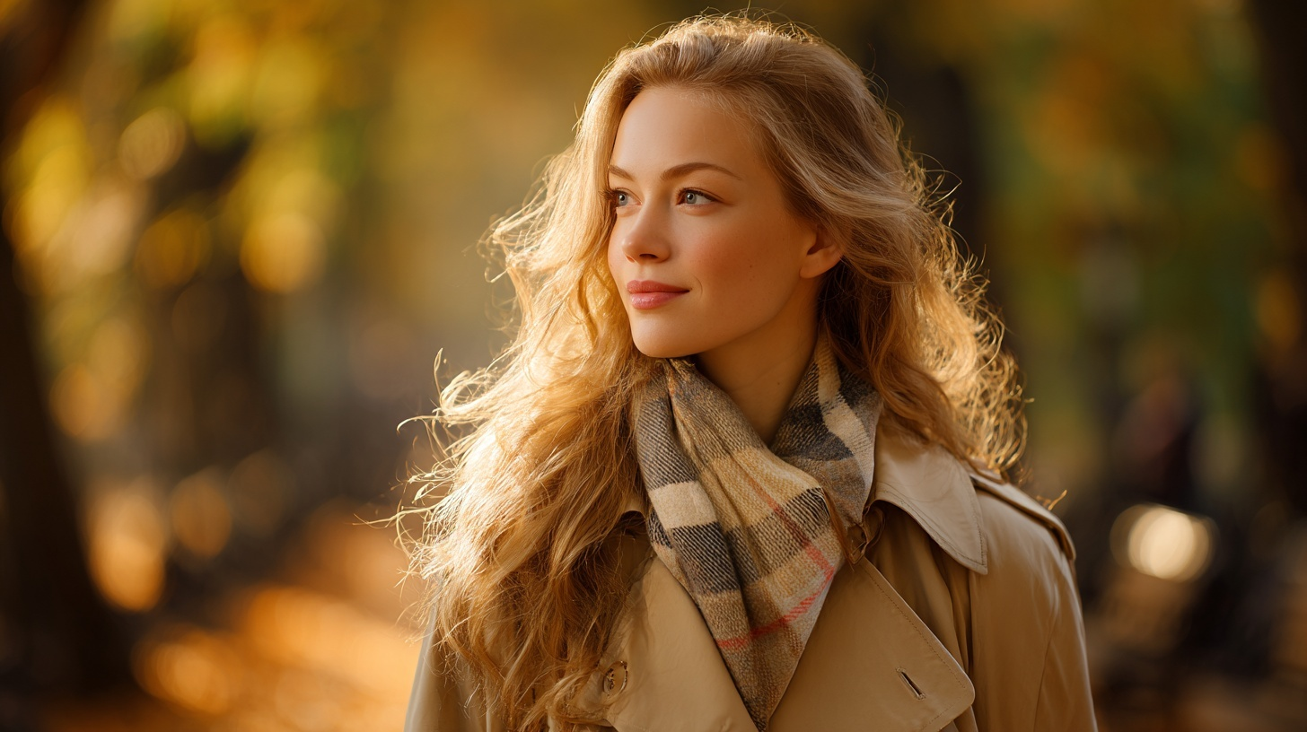 Модный осенний портрет: женщина с длинными пепельно-русыми волосами элегантно прогуливается по парковой аллее, покрытой золотыми опавшими листьями. На ней классическое бежевое тренч-пальто и большой шерстяной шарф в клетку, небрежно накинутый на плечи. Изящная осанка, мягкий естественный золотой свет позднего осеннего дня, нежная подсветка волос сзади, мечтательное боке, спокойное и утончённое настроение, высокий уровень детализации, фотосъёмка на Canon EOS R5 с объективом 85mm f/1.2L, стиль журнальной фотографии.