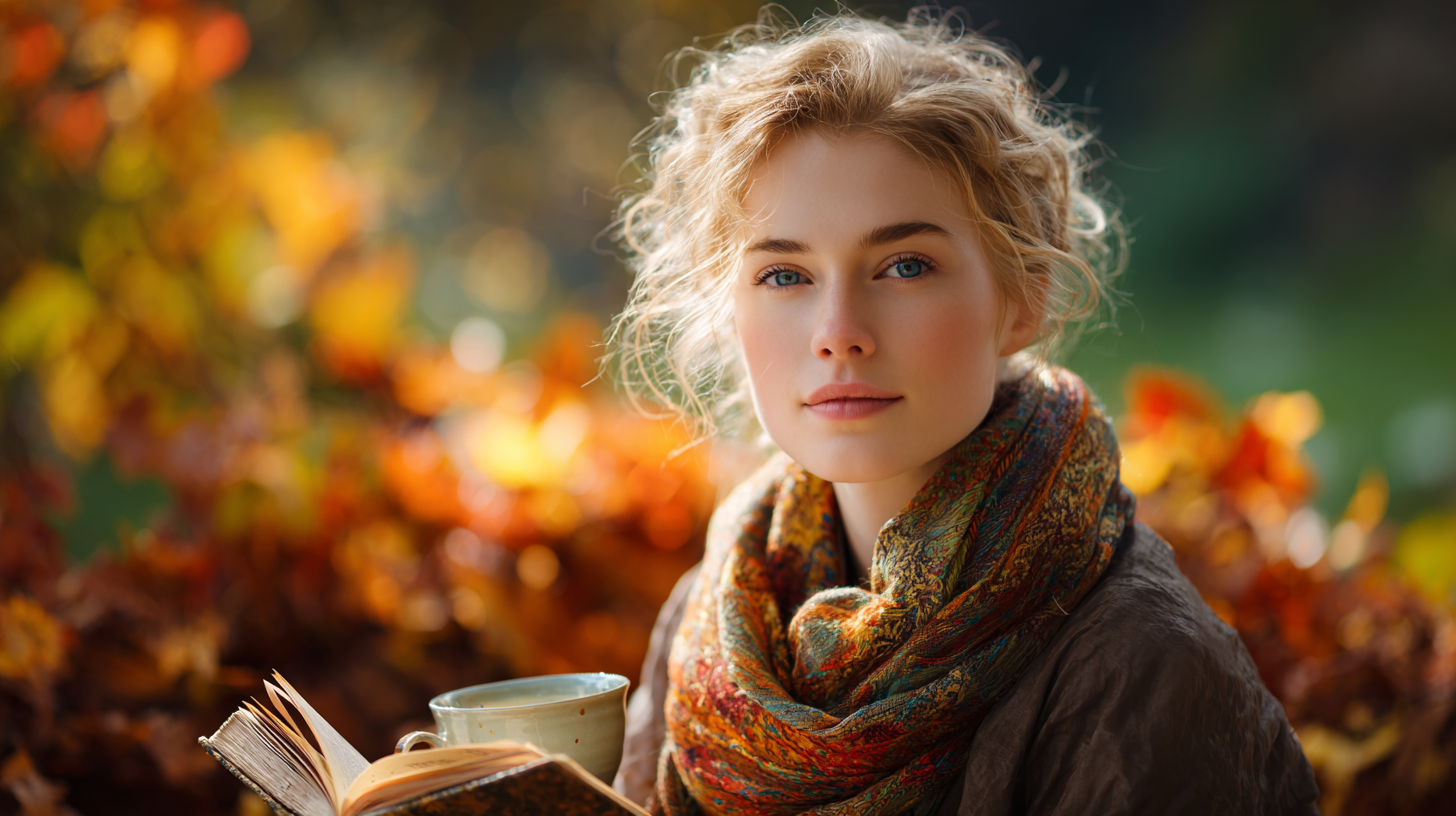 Модный уютный осенний портрет: молодая светловолосая женщина изящно сидит на парковой скамейке или уютно устроилась в ворохе ярких опавших листьев, укутанная в толстый шерстяной шарф, в стильной тёплой куртке, нежно держит чашку кофе или открытую книгу. Мягкая естественная поза, задумчивое и доброе выражение лица, мечтательный золотой солнечный свет красиво подсвечивает волосы и лицо, фон в мягком фокусе с богатыми осенними оттенками, кинематографичное естественное боке, ультра высокое разрешение, снимок на Canon EOS R5 и объектив 85mm f/1.2L, спокойная и располагающая атмосфера.