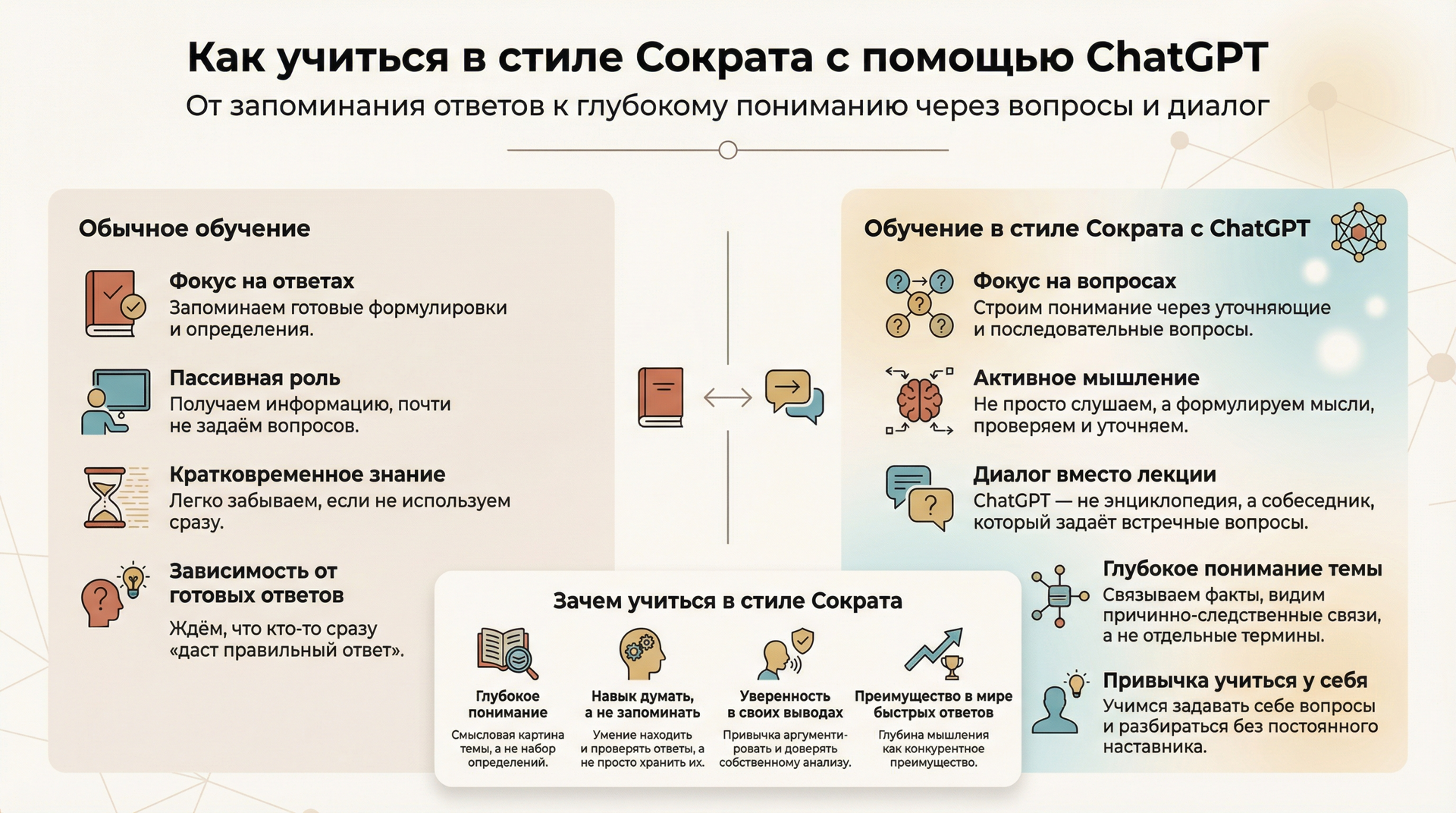 Обучение часто сводится к получению готовых ответов. Но гораздо ценнее — научиться задавать правильные вопросы, видеть связи между фактами и развивать собственное мышление.