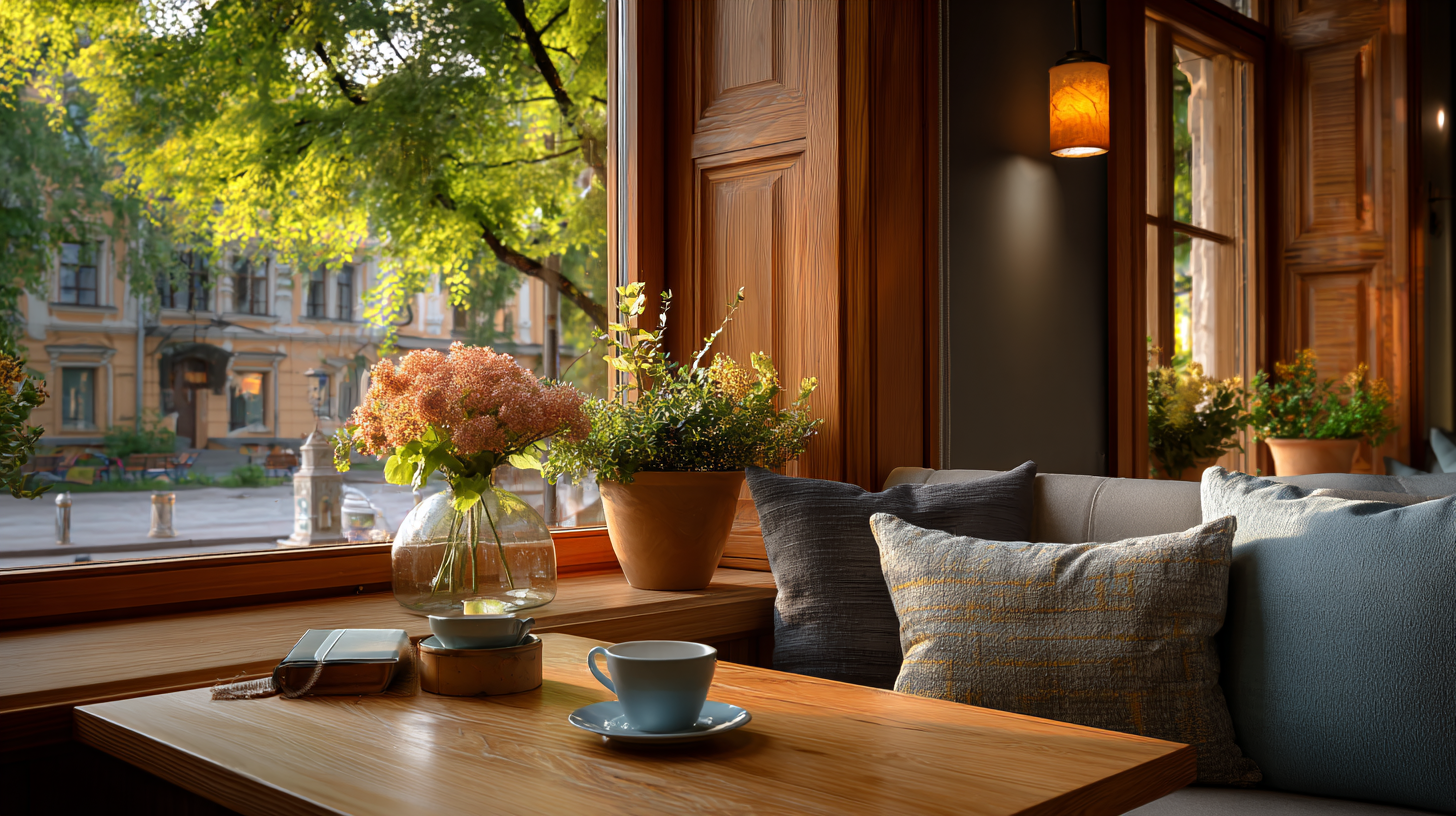 Пример улучшенного промта: маленькая уютная кофейня, вид изнутри на улицу, тёплое утро, мягкий рассеянный свет, деревянные столы, мягкие кресла, тёплые пастельные тона, лёгкое боке за окном, --ar 16:9.