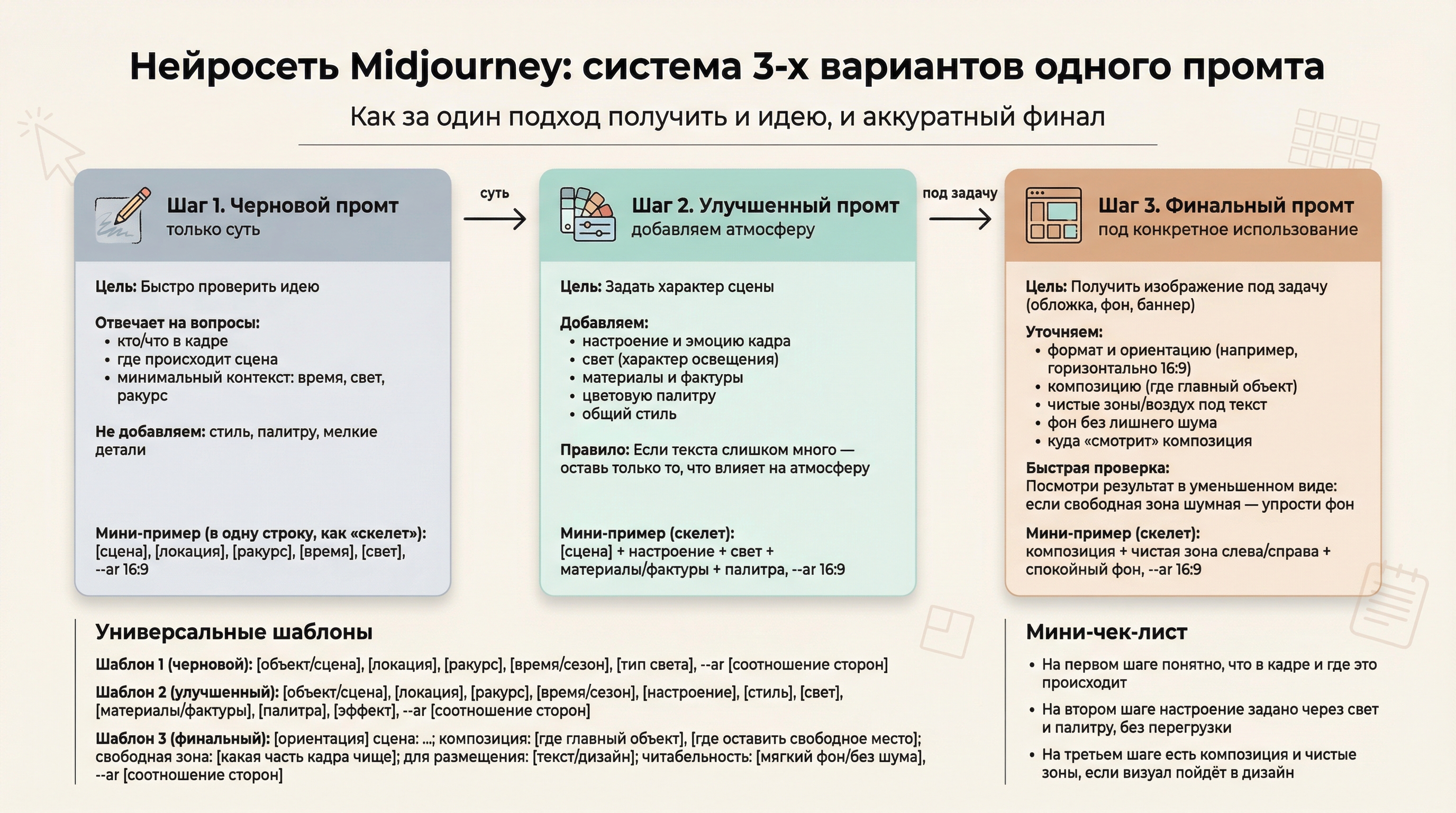 Суть подхода простая: вместо одного “идеального” промта делаем три версии под одну и ту же идею. Это похоже на процесс в дизайне: сначала быстрый набросок, потом настройка атмосферы, и только в конце точная формулировка под конкретное использование.