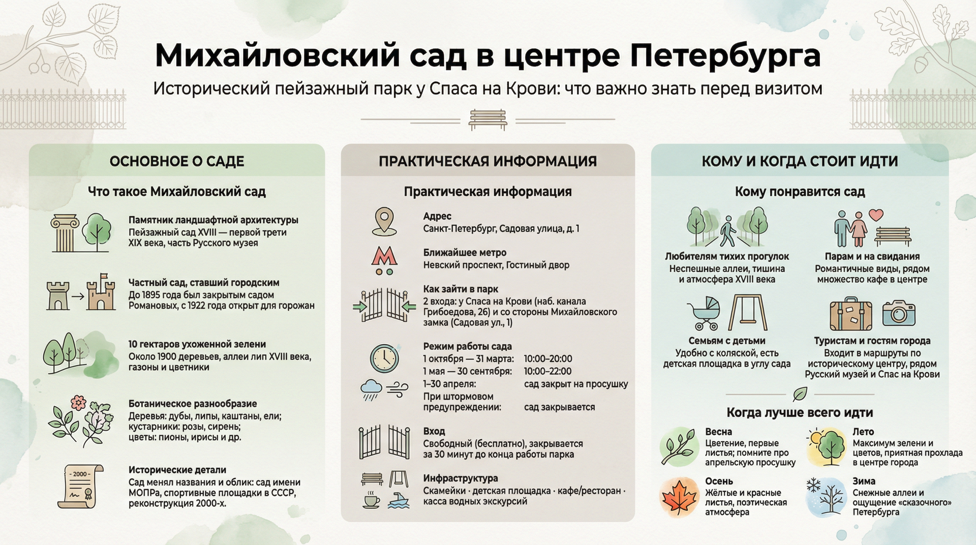 | Как зайти в парк | Парк имеет 2 входа: возле храма Спас на Крови (набережная канала Грибоедова, дом 26) и второй со стороны Михайловского замка (Садовая улица, д. 1) |