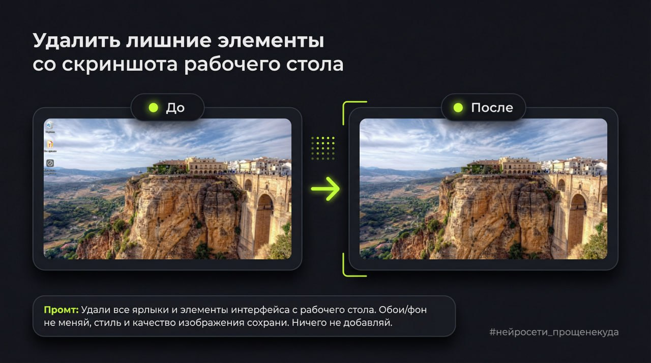 Удали все ярлыки и элементы интерфейса с рабочего стола. Обои/фон не меняй, стиль и качество изображения сохрани. Ничего не добавляй.