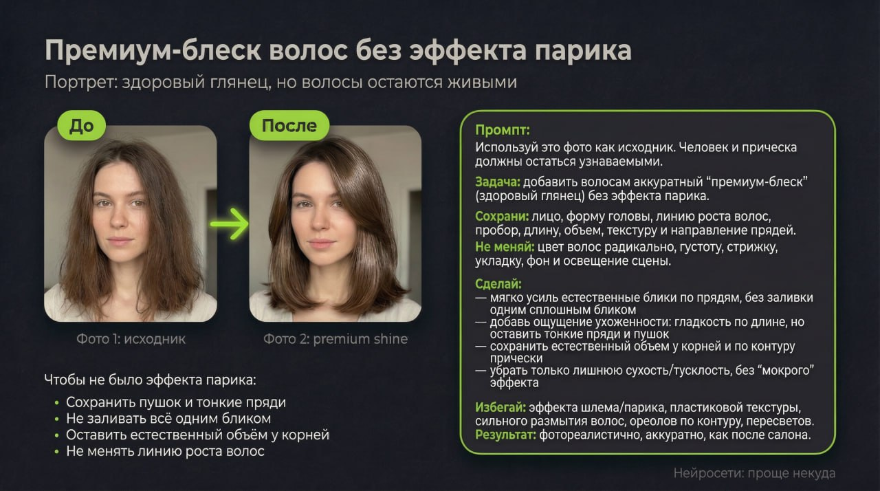 Самая частая проблема “улучшайзинга” волос — они становятся слишком идеальными: гладкий шлем, одинаковый блик, пропадает пушок и живые пряди. Наша задача наоборот: добавить ухоженный “премиум‑глянец”, но оставить натуральную текстуру и объём.