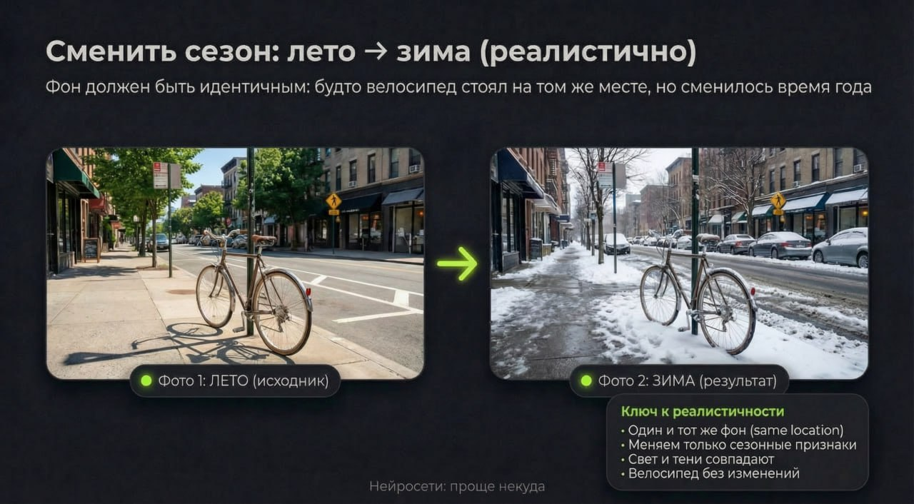 Вместо пересъёмки можно аккуратно сменить сезон нейросетью: лето → зима или зима → лето, сохранив объект/человека и реалистичный свет.