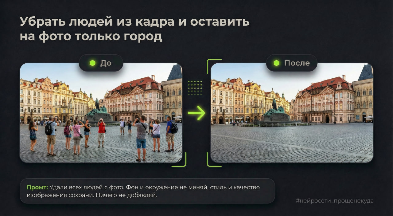 Этот способ будет полезен, если фото в целом классное, но выглядит “шумно”, потому что в кадре слишком много людей. Это особенно заметно в снимках из путешествий: площадь, смотровая, центр города - хотели “архитектуру”, а получилось “много людей + архитектура”.
