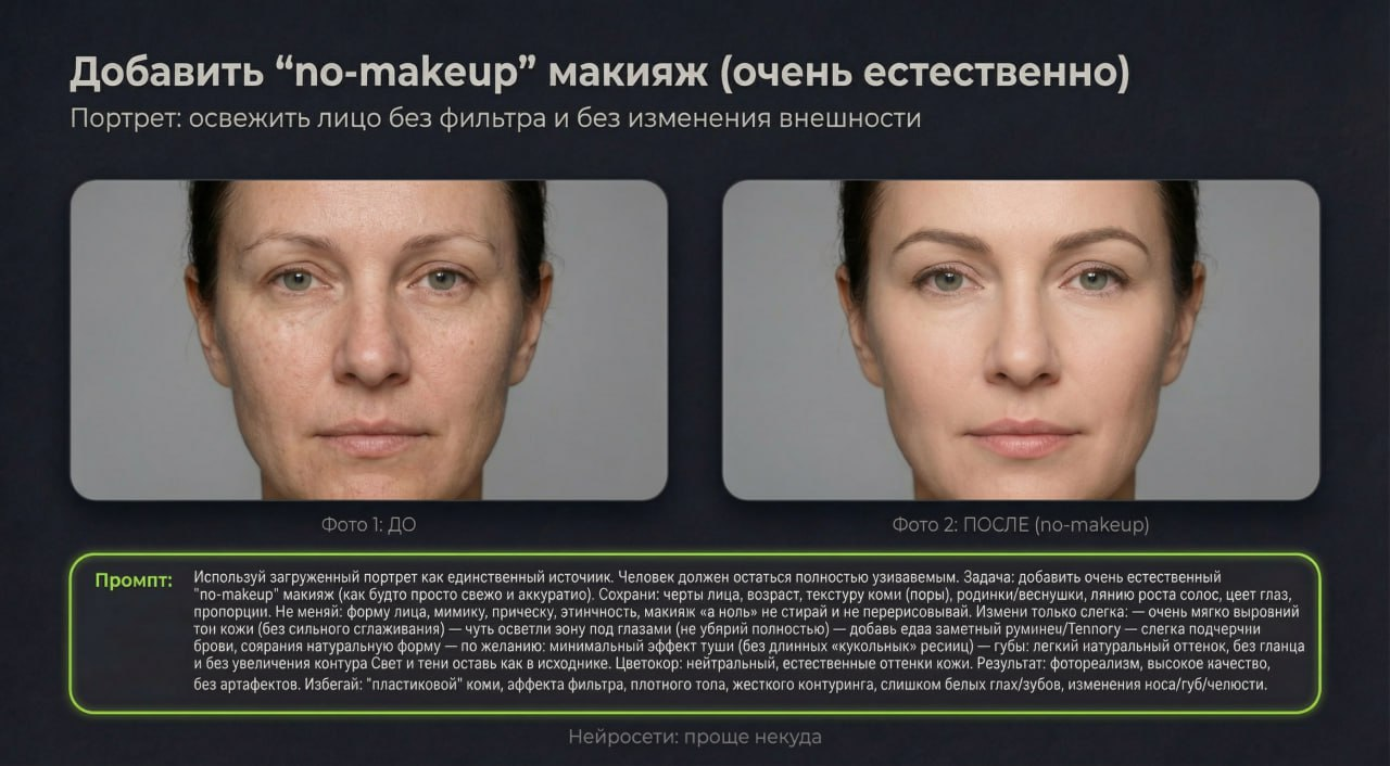 Используй загруженный портрет как единственный источник и добавь очень естественный макияж в стиле «без макияжа», максимально незаметный и фотореалистичный, при этом человек должен остаться полностью узнаваемым — сохрани черты лица, возраст, текстуру кожи с порами, родинки и веснушки, линию роста волос, цвет глаз и пропорции; не меняй форму лица, мимику, причёску, этничность и выражение; измени только слегка: очень мягко выровняй тон кожи без сильного сглаживания, немного осветли зону под глазами, не убирая её полностью, добавь едва заметный румянец и лёгкую теплоту, слегка подчеркни брови с сохранением их натуральной формы, при желании добавь минимальный эффект туши без длинных «кукольных» ресниц, а губам придай лёгкий натуральный оттенок без глянца и без увеличения контура; сохрани исходные свет и тени, выполни нейтральную цветокоррекцию с естественными оттенками кожи; результат должен быть высокого качества, с чистыми деталями, без артефактов, без «пластиковой» кожи, эффекта фильтра, плотного тонального покрытия, жёсткого контуринга, слишком белых глаз или зубов, а также без изменений формы носа, губ и челюсти.