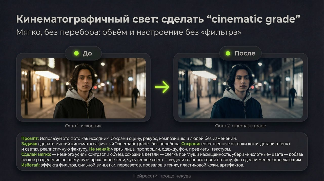 Используй загруженное фото как исходник и выполни мягкую кинематографичную цветокоррекцию без перебора, полностью сохранив сцену, ракурс, композицию и всех людей и объекты без изменений; сохрани естественные оттенки кожи, детали в тенях и светах, реалистичную фактуру и исходную резкость; не меняй черты лица, пропорции, одежду, фон, предметы и геометрию кадра; мягко усиль контраст и объём, не теряя деталей, слегка приглуши насыщенность и убери слишком «кислотные» цвета, добавь лёгкое цветовое разделение — чуть более прохладные тени и чуть более тёплые света, аккуратно выдели главного героя по тону, а фон сделай менее отвлекающим без сильного размытия; избегай эффекта фильтра, сильной виньетки, пересвеченных участков, провалов в тенях, пластиковой кожи, артефактов и любых изменений лиц; результат должен быть фотореалистичным, аккуратным, естественным и выглядеть «как в кино».