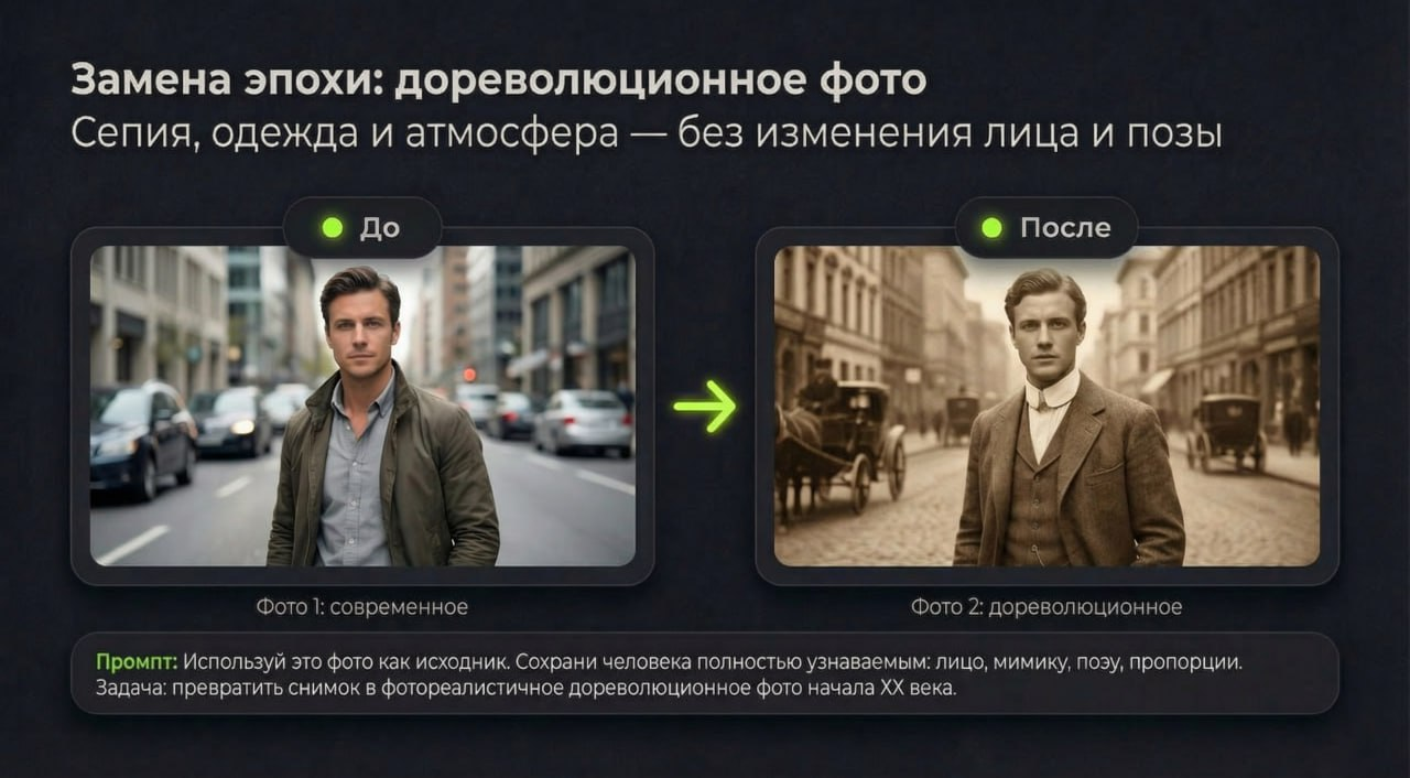 Замена эпохи: “дореволюционное фото” (сепия, одежда, атмосфера)