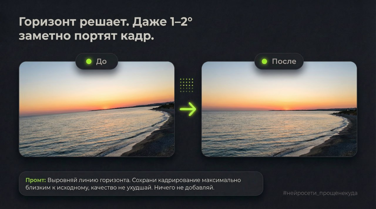 Иногда фото хорошее, но ощущение «что-то не так», потому что горизонт чуть завален. На глаз почти незаметно, а выглядит неаккуратно.